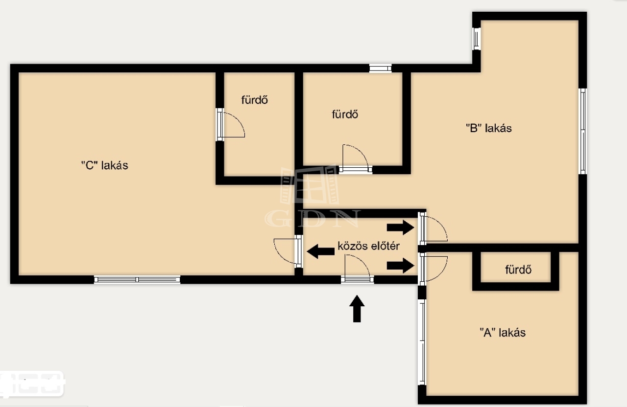 Az ingatlan egy nagyobb lakásból került kialakításra, osztatlan közös tulajdonban, ügyvéd által ellenjegyzett használati megosztással. A három lakás egy közös előtérből nyílik, jelenleg még mindegyik eladó.