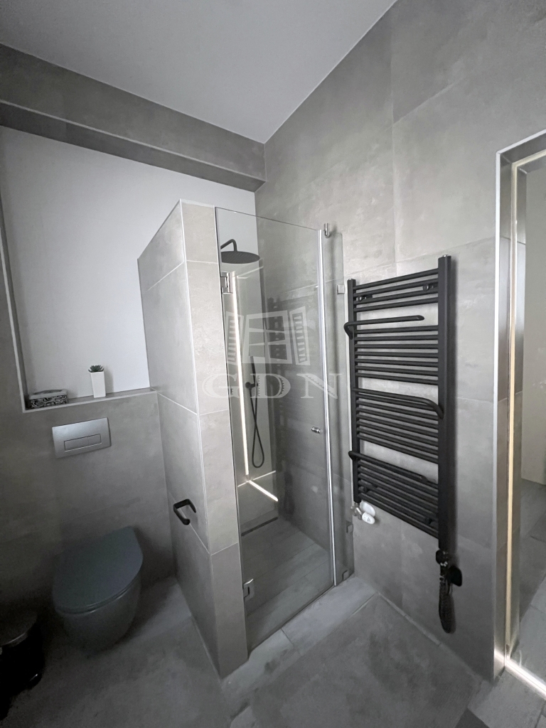 Az alaprajzhoz képest az emeleten a szülői hálószobából egy elegáns tükör tolóajtón keresztül közvetlenül is megközelíthető a fenti fürdőszoba, amely szintén prémium érzetet ad ennek a helyiségnek is.