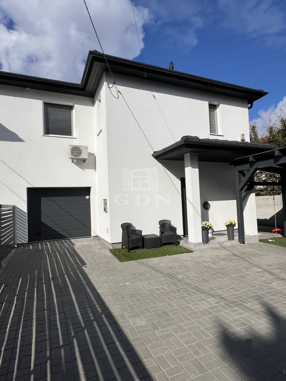 Az előkert teljes területe térkővel burkolt, így a garázson felül további 2 autó számára fedett beállási lehetőség biztosított.