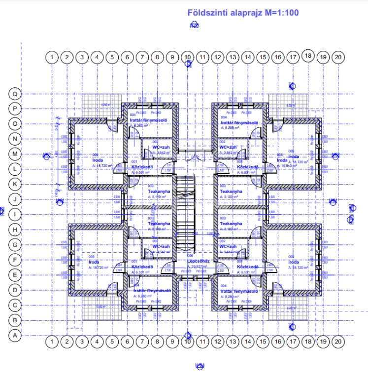 Az irodák 45 nm alapterületűek, amik tartalmaznak: