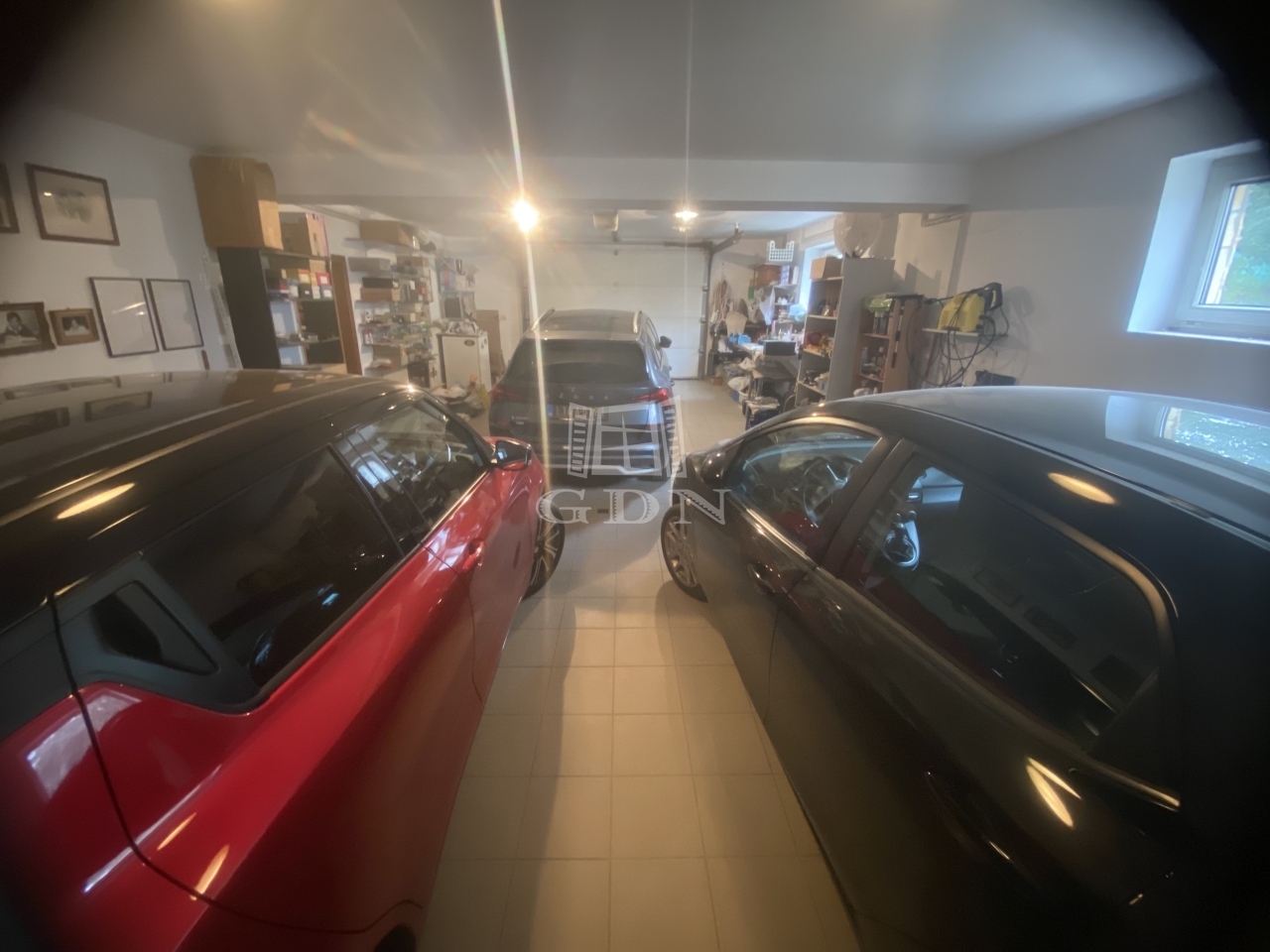 Az épület alsó szintjén található garázs három autó kényelmes elhelyezésére alkalmas.