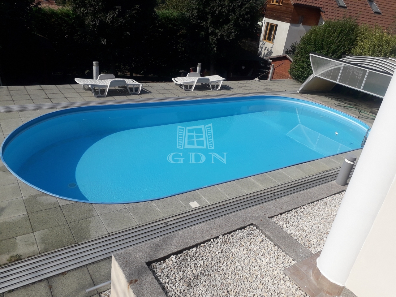A kertben 10x4 m-es fedhető medence kapott helyet vízforgatóval, gépészettel.