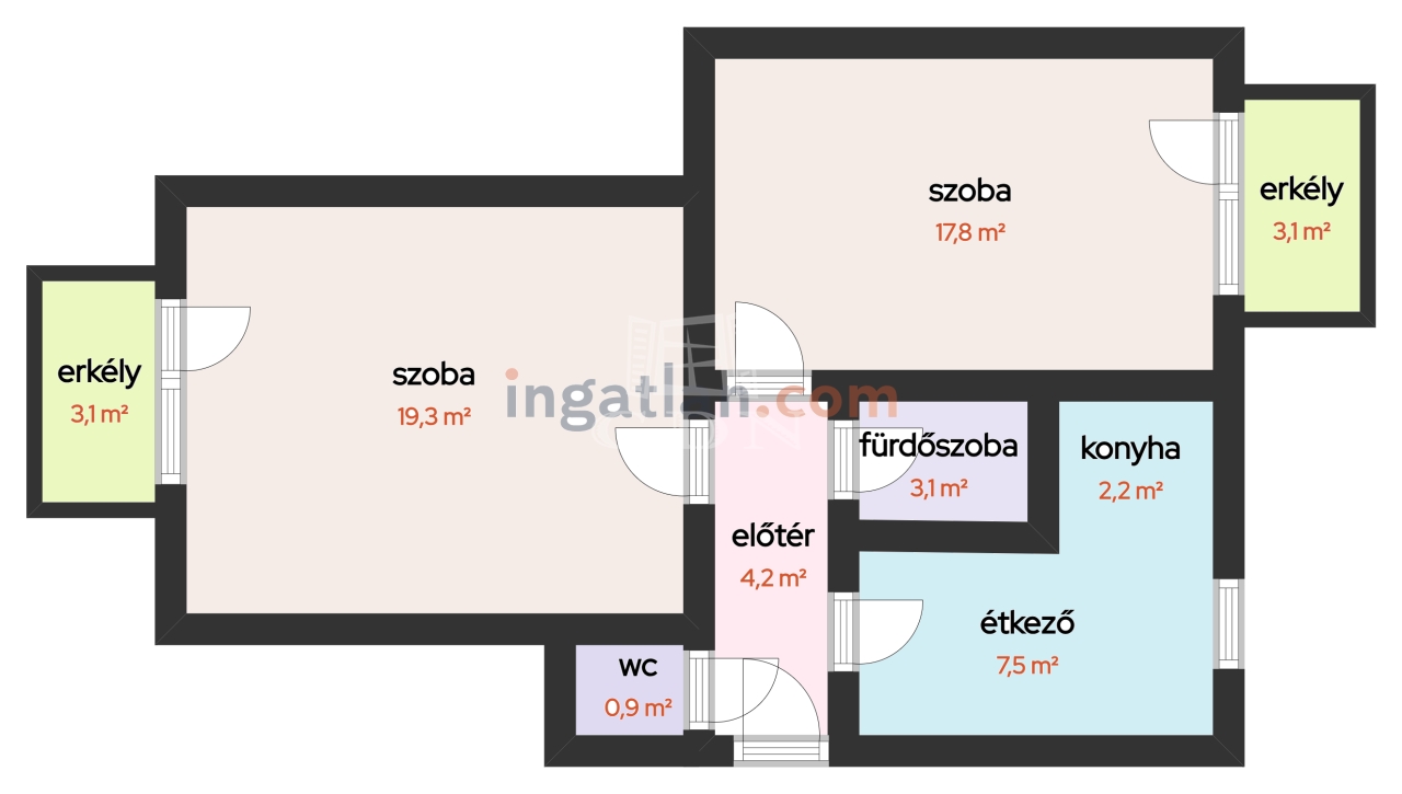 19,26m2, szoba 17,81m2, fözőfülke 2,17m2, étkező 7,52m2 fürdőszoba 3,11m2, wc 0,85m2, előszoba 4,24m2, erkély 3,1m2, erkély 3,1m2;