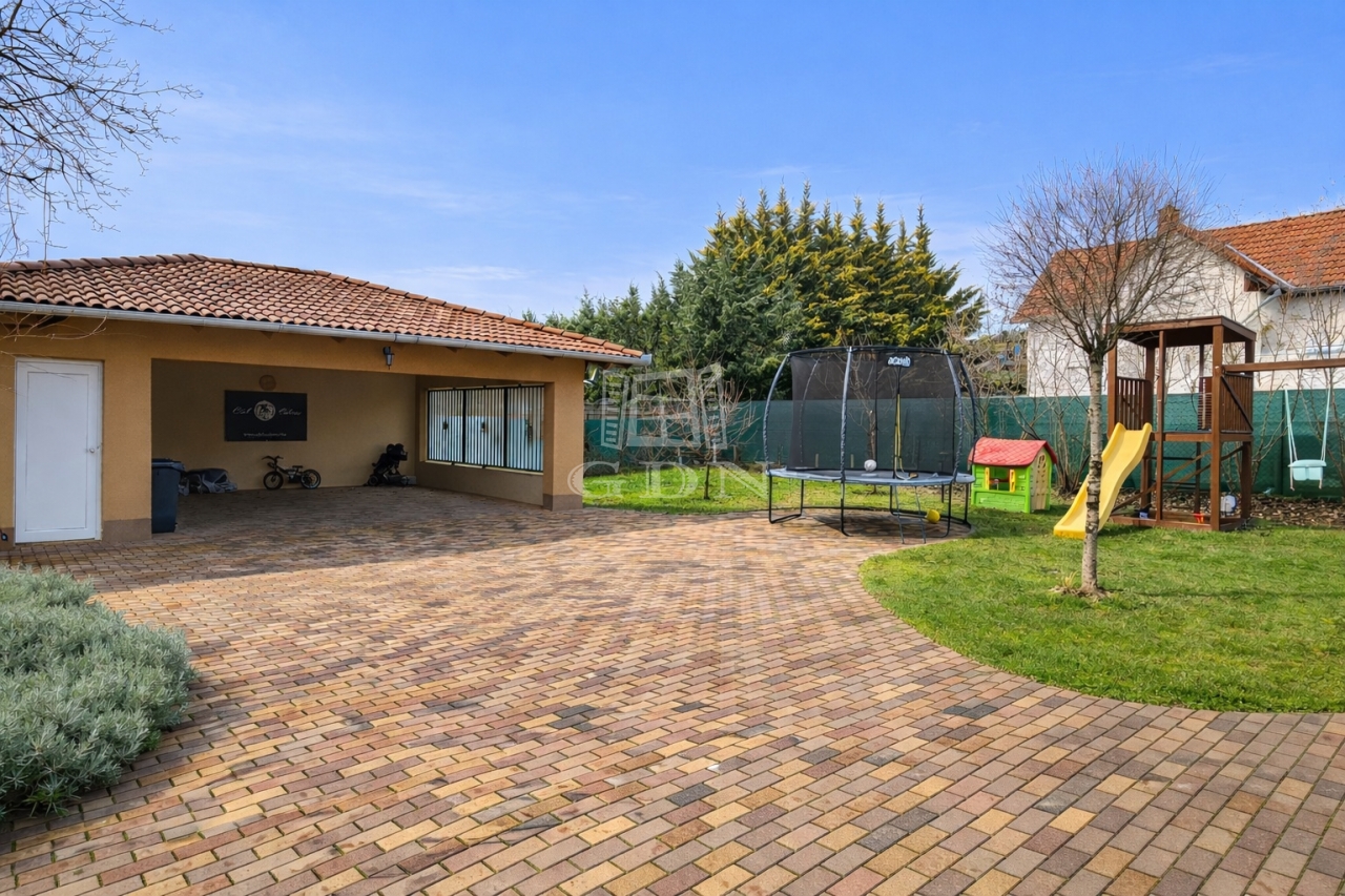 A hátsó kert sarkában dupla autóbeálló került kialakításra, térkövezett felhajtóval.