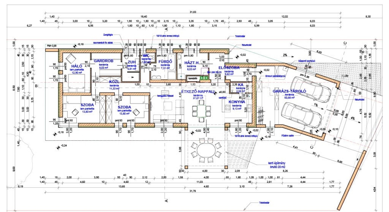 ✔ 51 m²-es a lakótérhez közvetlenül kapcsolódó, fűtött, kétállásos garázs